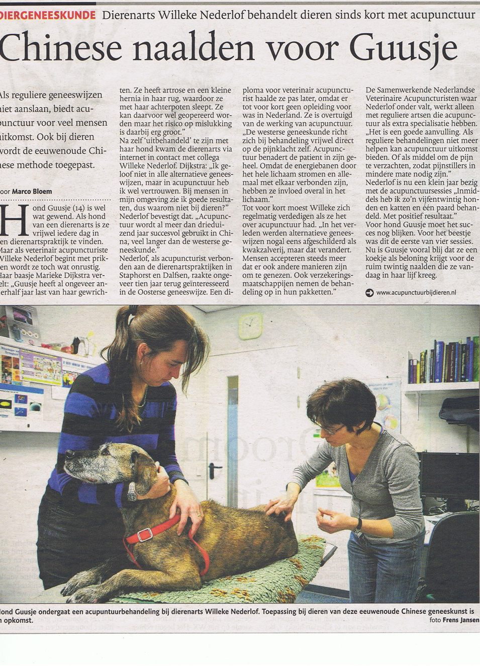 Acupunctuur bij dieren Willeke Nederlof Als dierenarts heb ik gedurende een lange periode ervaring. Enige jaren geleden is mijn belangstelling voor acupunctuur ontstaan. Vooral vanwege het feit dat je zonder reguliere medicijnen, klachten van dieren effectief kunt behandelen. Aangezien uw huisdier of paard steeds ouder wordt, komen er ook steeds meer zowel acute als chronische (pijn-)klachten voor. Deze worden vaak langdurig behandeld met medicatie. In veel gevallen kan acupunctuur als aanvulling op de medicatie het herstel bevorderen. In een aantal gevallen kan acupunctuur na verloop van tijd de medicatie geheel vervangen. Het bijzondere van acupunctuur is de holistische benadering van de patiƫnt: je bekijkt het dier in zijn geheel. De behandeling is er op gericht om het lichaam als geheel beter te laten functioneren. Acupunctuur is een waardevolle aanvulling op de reguliere diergeneeskunde. Zo kunnen we de hoogst mogelijke medische zorg aan uw dier bieden. Lees ook 'Chinese naalden voor Guusje' |